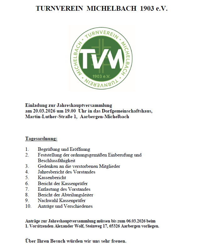 Der TV Michelbach 1903 e.V. lädt alle Mitglieder herzlich zur Jahreshauptversammlung am Freitag, 21. März 2025 um 19:00 Uhr ins Dorfgemeinschaftshaus von Aarbergen-Michelbach (Kirchstraße 4) ein. Bitte beachten Sie, dass Anträge zur Jahreshauptversammlung bis zum 14. März 2025 beim 1. Vorsitzenden Alexander Wolf, Steinweg 17, 65326 Aarbergen vorliegen müssen. Der Vorstand freut sich auf Ihren Besuch.